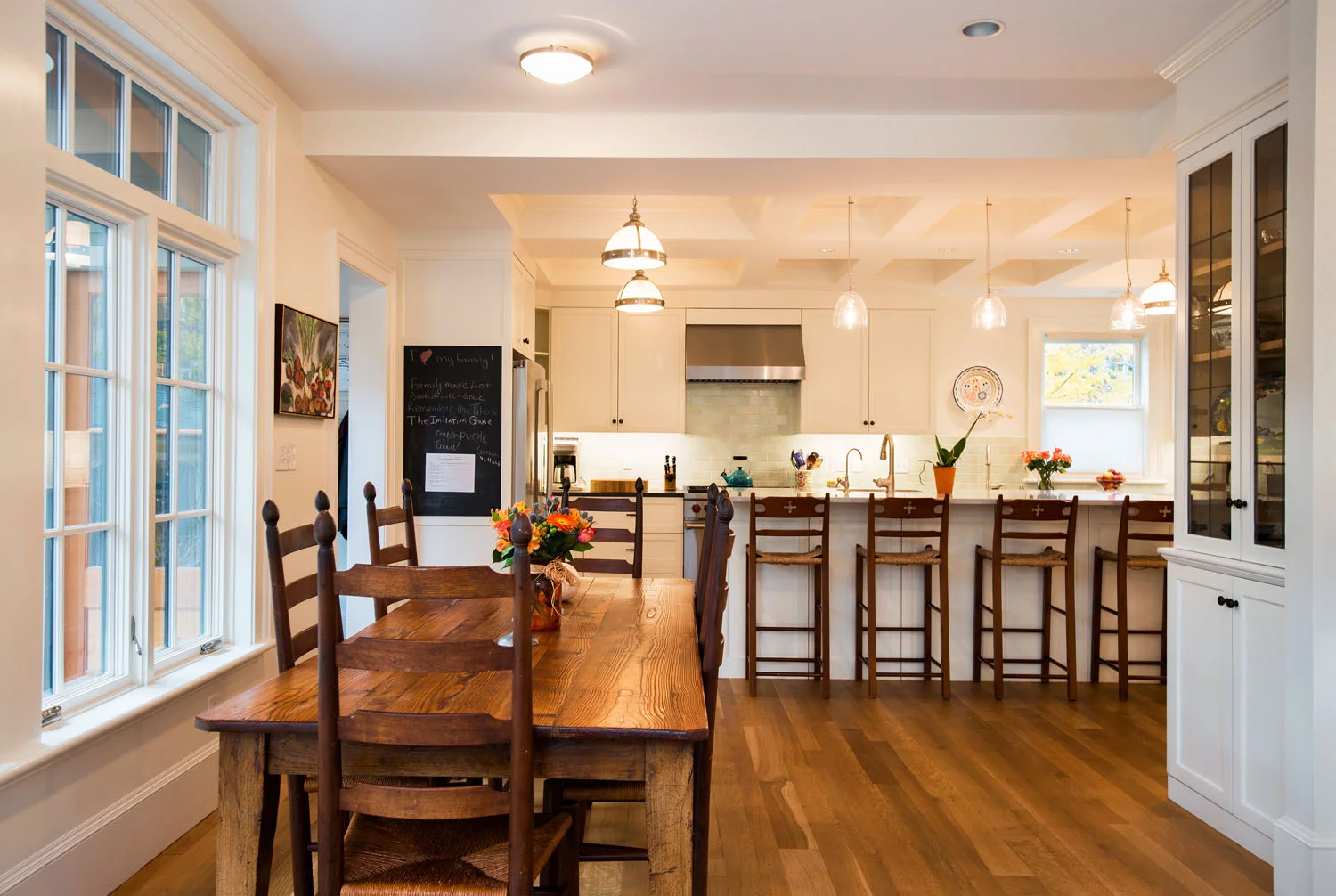 This project started with feasibility studies. The house is lovely, and the kitchen recently renovated by the previous owners, but several issues needed addressing for this young family of 5. There is no mudroom; the kitchen layout is poor and the clearances tight. There is inadequate space for the family to gather or for informal entertaining, and connection to the rear yard garden, both visually and physically is restricted. Incite did a series of studies ranging from modest modifications, leaving the kitchen more or less intact, to a complete reworking of the kitchen with additions to create a mudroom and family room. Once the family saw the possibilities, there was no turning back. In addition to the first floor work the proposed new construction allowed us to add a second floor bedroom so the 2 young sons, who currently share a bedroom, can have 2 rooms to share. When older they will move into 3rd floor bedrooms and these rooms will become a guest suite. A full reworking of the rear yard is being designed with terraces coordinated with our large deck off the family room.