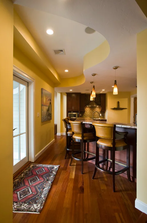 Design an addition for a two-and-a-half story home to contain a swimming pool and vertical conveyance connecting the existing basement, first floor, and second floors. The home was built with a narrow, switchback stair that is uncomfortable to use and challenging for moving furniture. Looking to age-in-place, the owners asked us to include an elevator along with the new, open stair hall. The home is on a sloping site, two stories to the front with a full walk-out basement story to the rear.